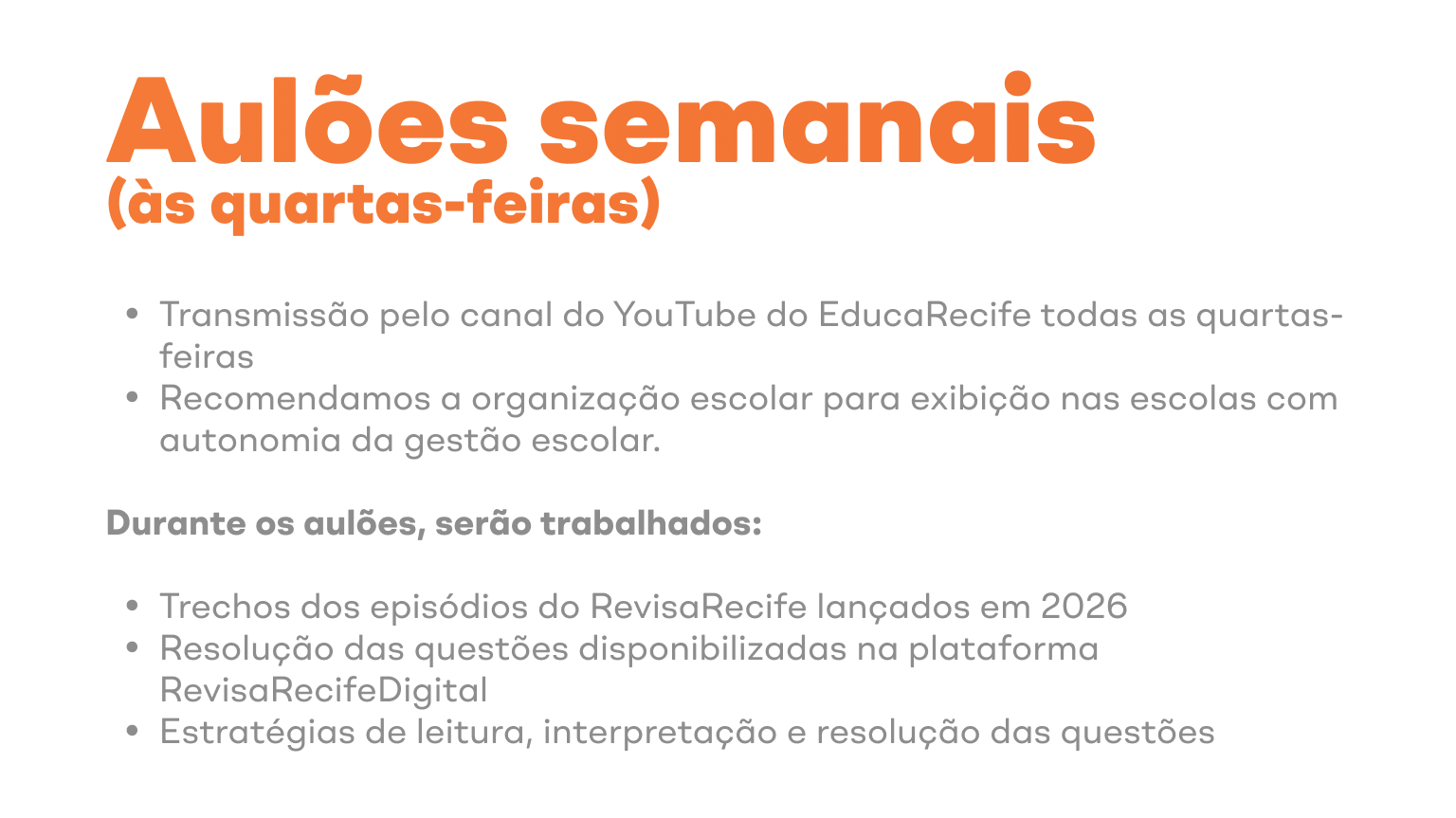 Neste ano, o Revisa Recife está ampliado e conta com novos conteúdos, fortalecendo ainda mais o processo de aprendizagem. Além de Língua Portuguesa e Matemática, os estudantes também terão acesso a vídeos de História, Geografia e Ciências, voltados tanto para Anos Iniciais quanto para Anos Finais, sempre alinhados às habilidades avaliadas nas avaliações externas.