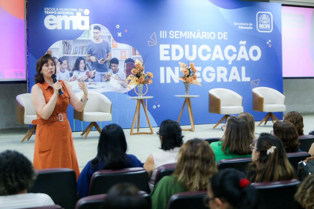 A programação do seminário contou com a palestra “Primeiro começa, depois melhora – os desafios e os caminhos da política de educação integral em tempo integral”, ministrada por Raquel Franzim, coordenadora-geral do Programa Escola em Tempo Integral no MEC. “O Recife tem sido um parceiro fundamental nesse processo de troca e aprendizagem, essencial para avançarmos no país. Fizemos questão de manter a expressão educação integral e em tempo integral, porque o tempo está a serviço de uma proposta pedagógica que amplia oportunidades e combate desigualdades. Nosso compromisso é superar o desafio do pouco tempo na escola e construir, juntos, uma educação mais justa e transformadora”, destacou.