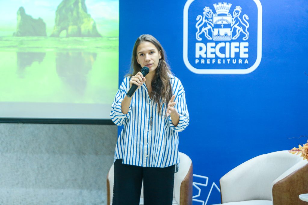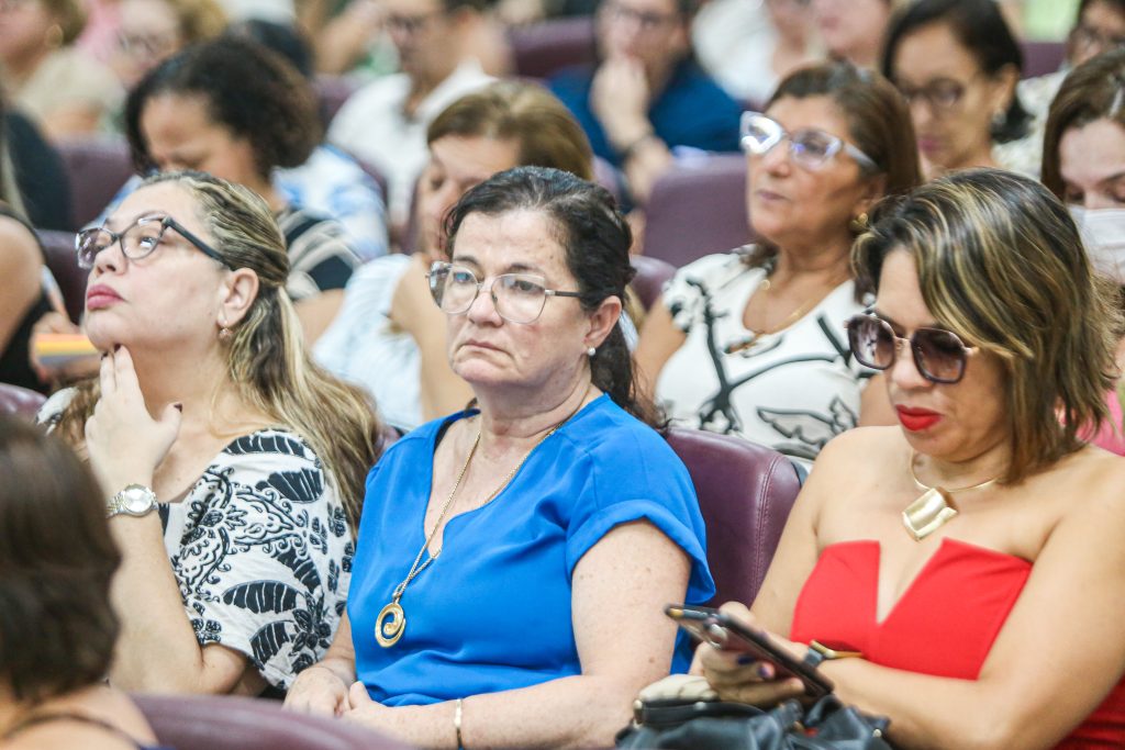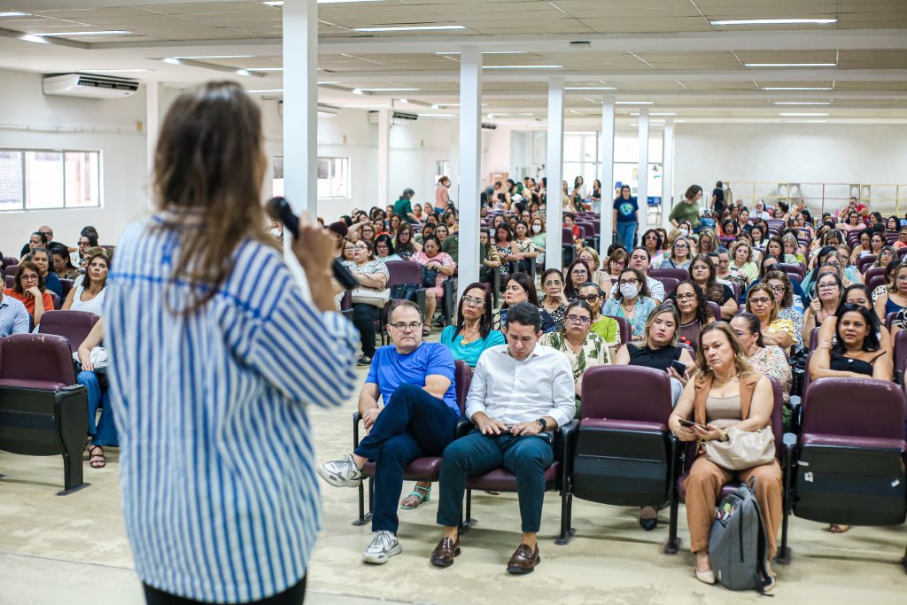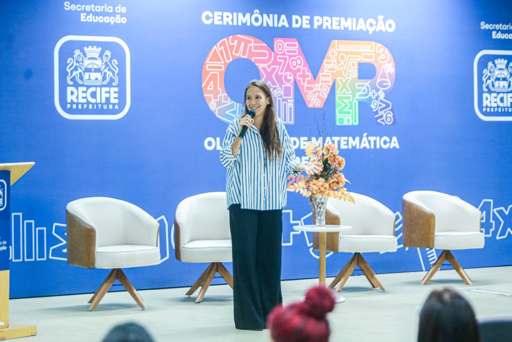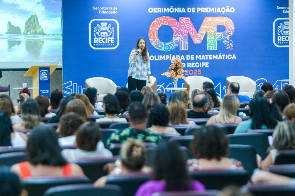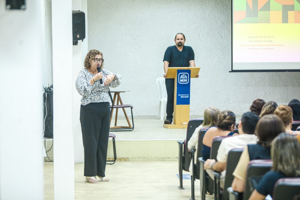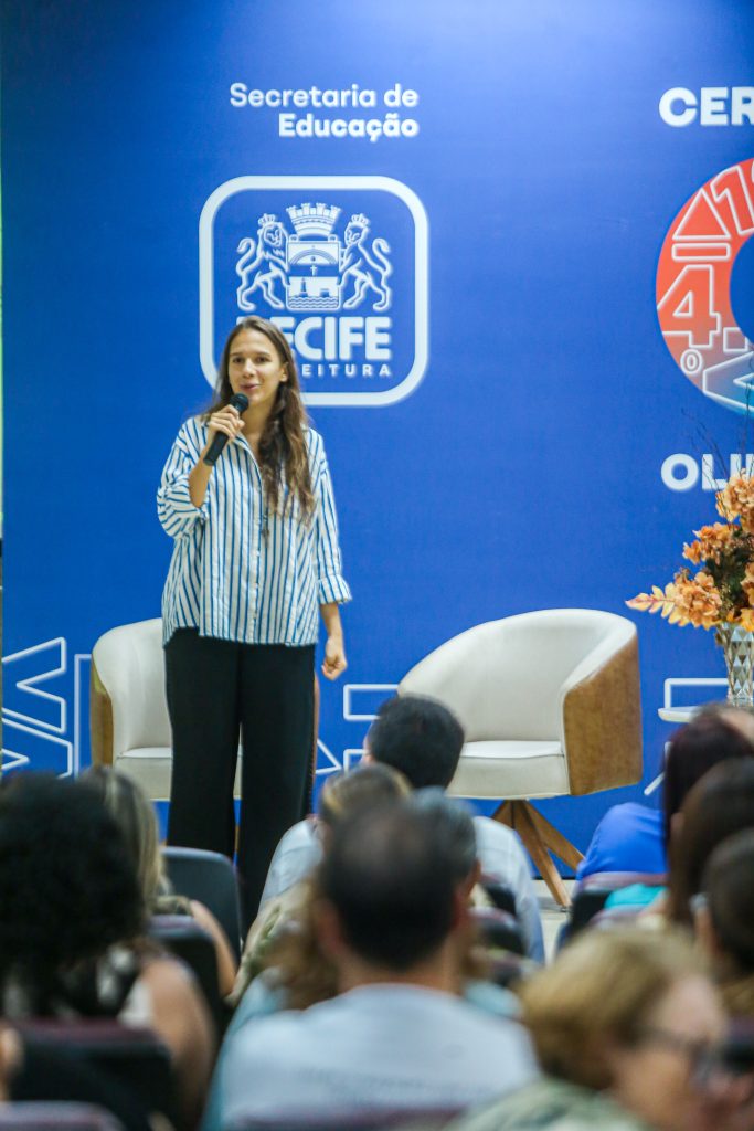 A programação teve início com um momento de acolhida, animado por música ambiente, seguido da fala da secretária de Educação do Recife, Cecília Cruz, que destacou os principais direcionamentos institucionais e reforçou as prioridades da rede para o próximo ano.